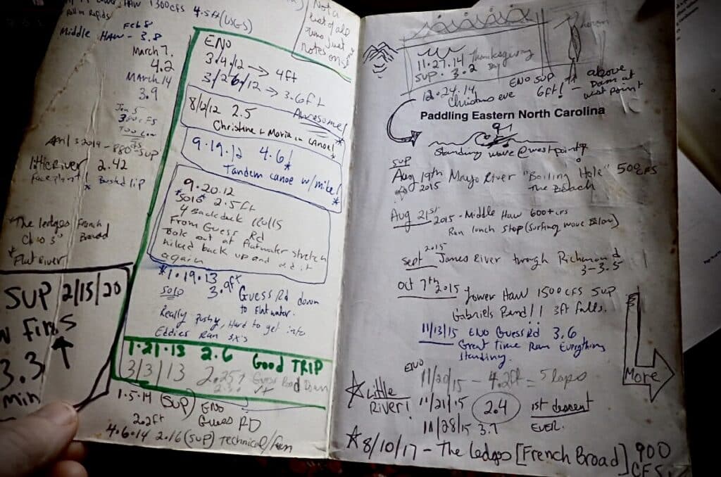 Whitewater stand-up paddleboarding is a great example. Inside my journal (see above), I keep notes on river levels, temperatures, conditions, and personal reflections on close calls or injuries.