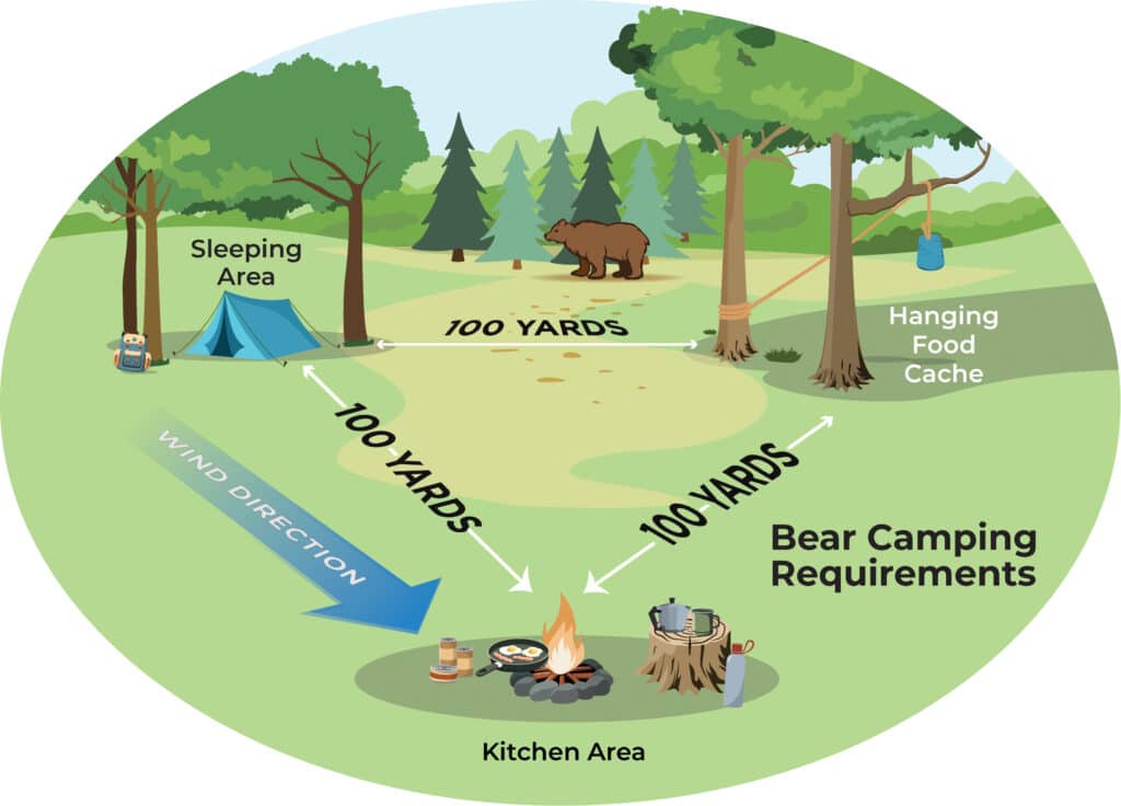 However, if you’re hiking in the backcountry, you’ll need to take some additional precautions. That means using specific food storage methods such as bear hangs or bear cans, and being intentional about how you arrange your campsite.