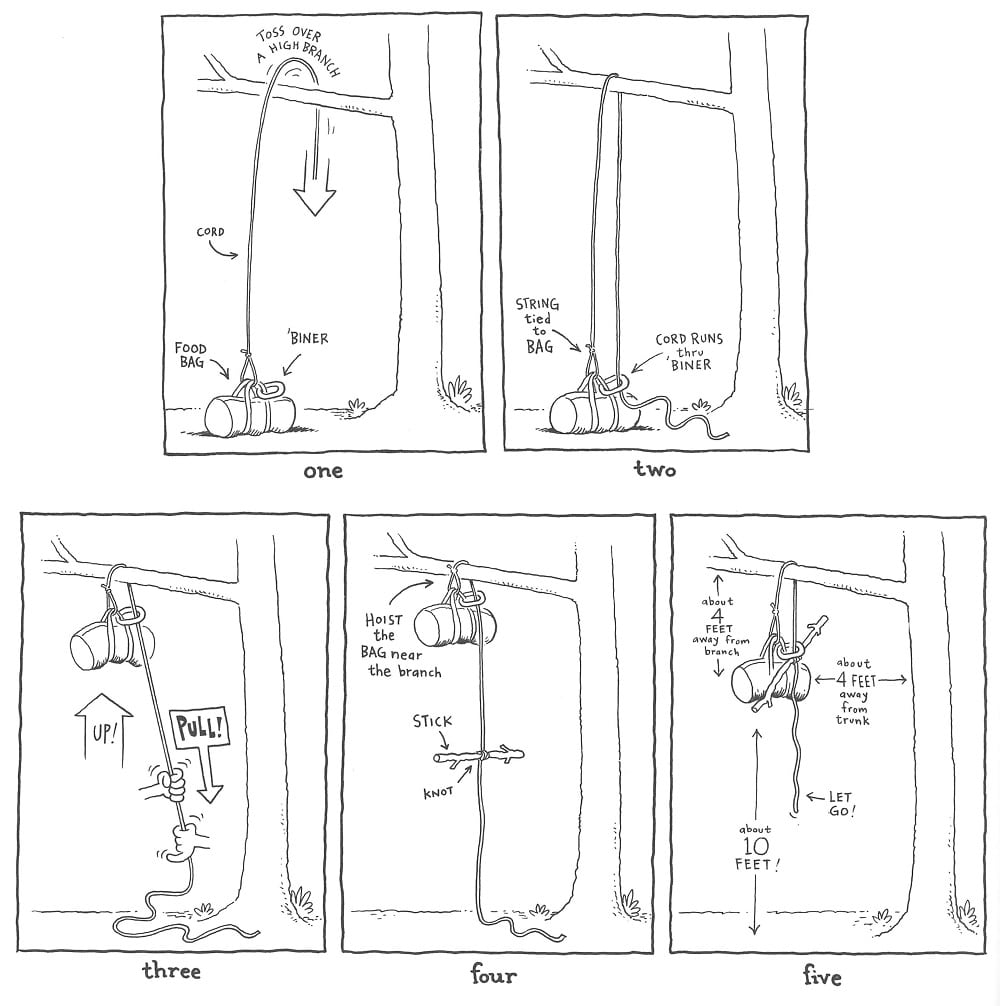 - Clip the carabiner onto your food bags and pull on the opposite end of the rope until the bags are at least 12 feet off the ground and five feet from the trunk of the tree.
